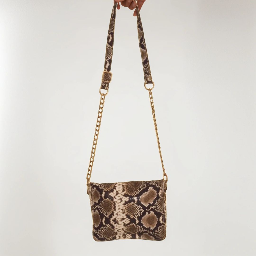 BOLSO ANIMAL PRINT CON ESTAMPADO DE SERPIENTE MARRÓN. CORREA DE ESTAMPADO DE SERPIENTE Y CADENA DORADA CON HEBILLAS PARA AJUSTAR LARGO.