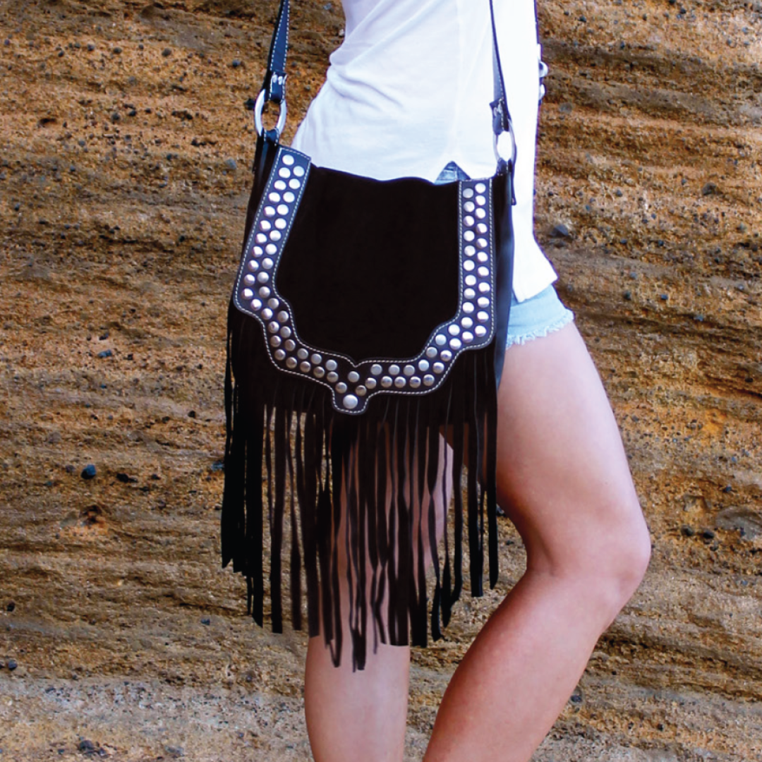 BOLSO CHEROKEE MARRÓN OSCURO CON FLECOS REALIZADA EN PIEL DE SERRAJE, CON DETALLES EN PLATEADO.