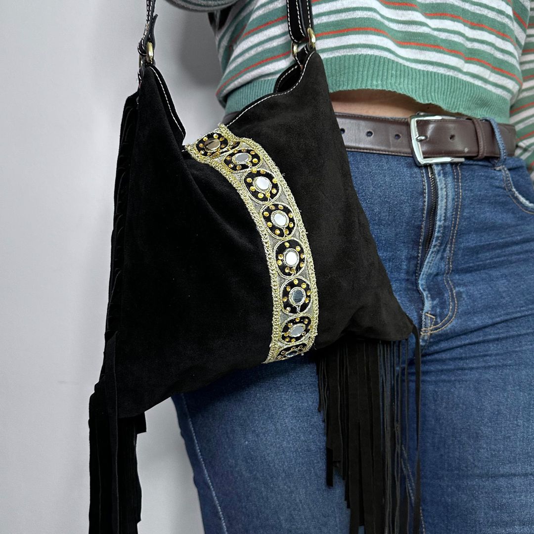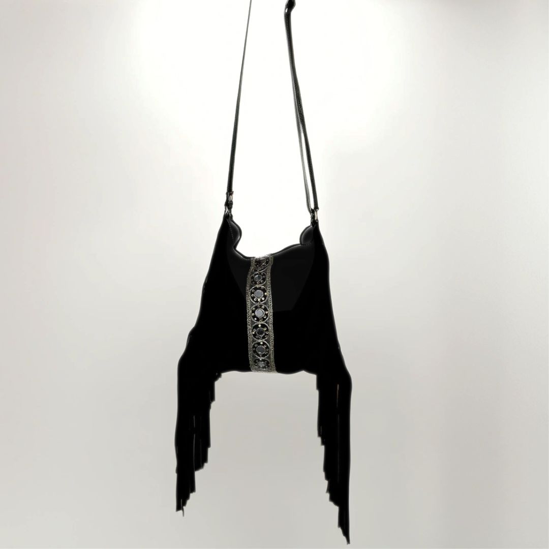 BOLSO NEGRO CON FLECOS REALIZADA EN PIEL DE SERRAJE, CON BOLSILLO INTERIOR. DECORADO CON ELEMENTOS DORADOS Y ESPEJOS CIRCULARES.