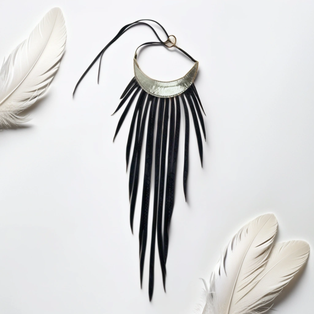 COLLAR TRIBAL DE CUERO MARRÓN OSCURO CON FLECOS REALIZADO EN PIEL. PERFECTO PARA UN LOOK ATREVIDO.
