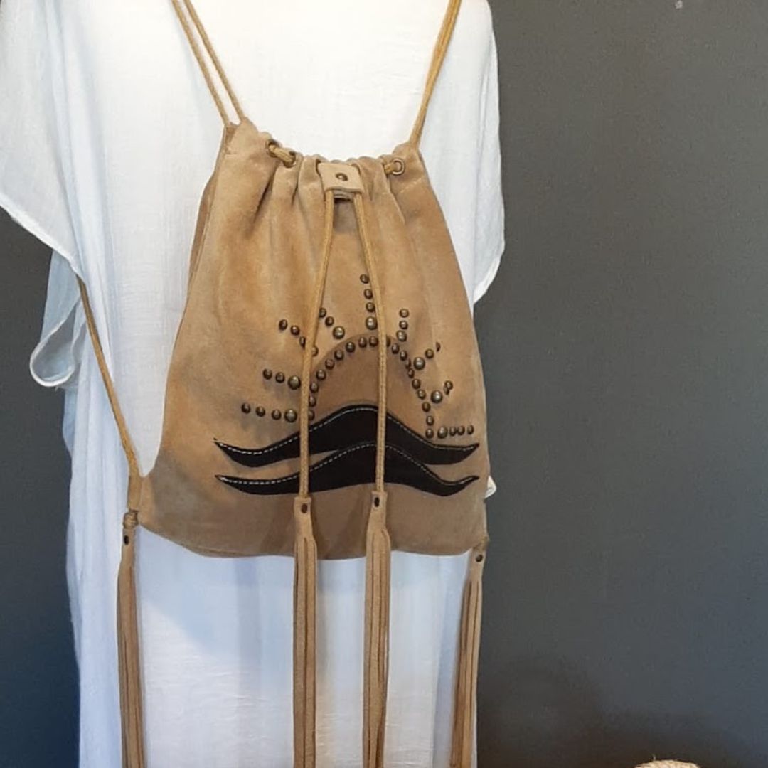 MOCHILA SUNRISE DE PIEL DE SERRAJE CON BOLSILLO INTERIOR Y DISEÑO DE AMANECER PINTADO EN NEGRO. TIENE BOLSILLO INTERIOR.