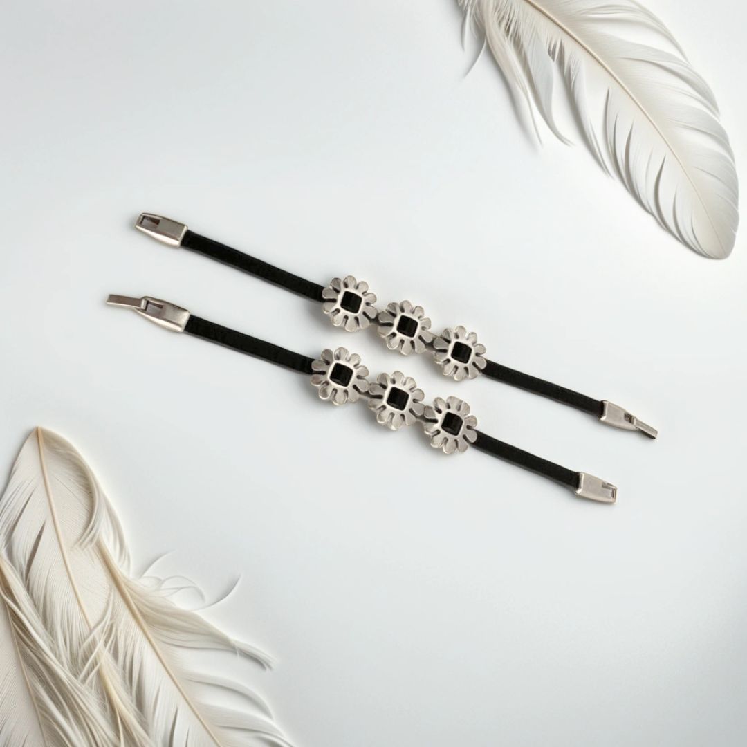 PULSERA DE CUERO REALIZADO CON PIEL DE VACUNO NEGRO. CON DETALLES PLATEADOS.