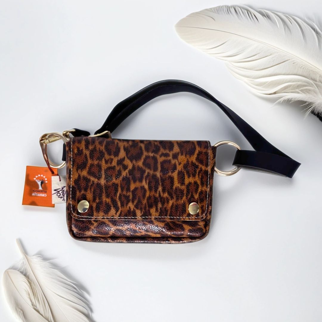 RIÑONERA ANIMAL PRINT REALIZADA EN CUERO MARRÓN COMBINADO CON ESTAMPADO DE LEOPARDO SOBRE MARRÓN, CON CINTURÓN DE CUERO MARRÓN OSCURO PARA AJUSTAR A LA CINTURA.