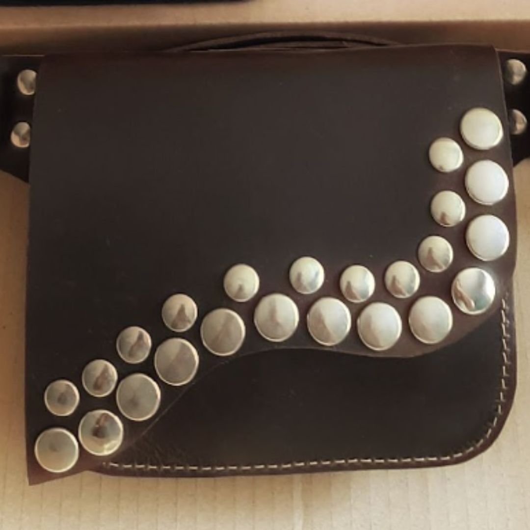 RIÑONERA ROCKERA MARRÓN REALIZADA EN PIEL DE VACUNO ENGRASADA DE CURTIDO VEGETAL DECORADA CON REMACHES PLATEADOS.