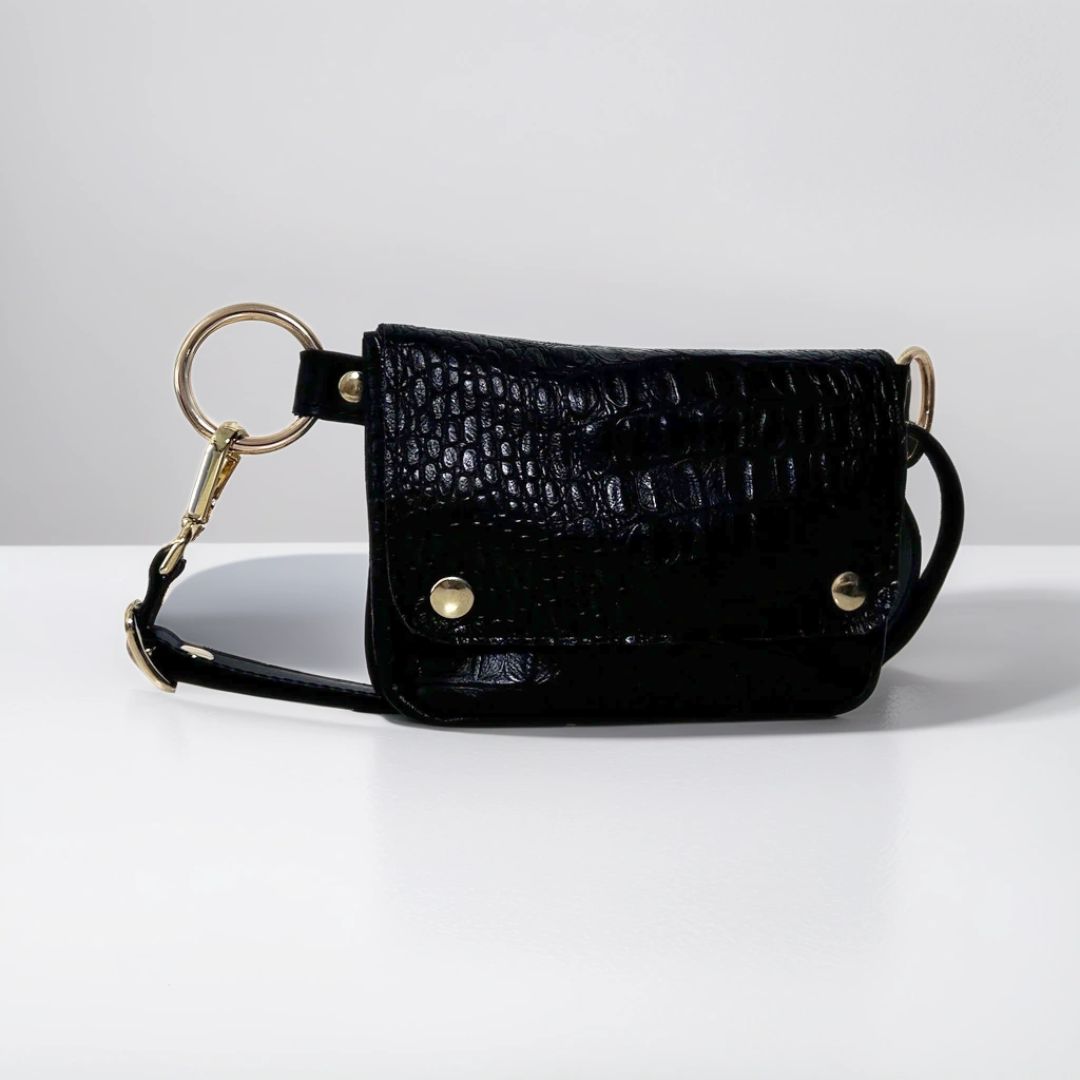 RIÑONERA SERPIENTE NEGRA REALIZADA EN PIEL DE VACUNO ENGRASADA DE CURTIDO VEGETAL DECORADA CON REMACHES DORADOS.